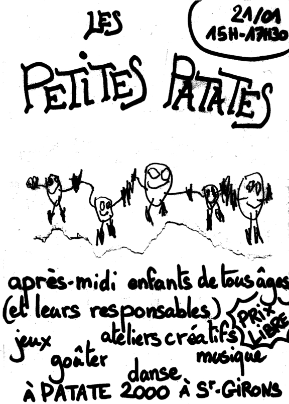 une après-midi pour les enfants à Patate 2000, avec goûter végétalien (venez découvrir la frangipane végane !), jeux, musique, danse, ateliers créatifs...