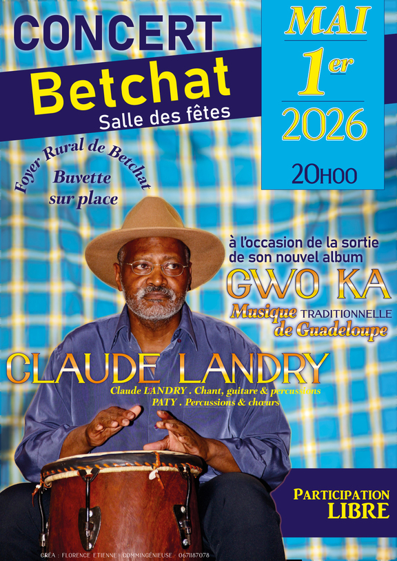 Concert de Claude Landry, à l'occasion de la sortie de son nouvel album, GwoKa Musiques de la Guadeloupe. Claude Landry, (chant, guitare et percussions) et Paty (percussions et choeurs). Le 1er mai 2026 à 20h à la salle des fêtes de Betchat. Participation Libre. Buvette du Foyer Rural sur place.