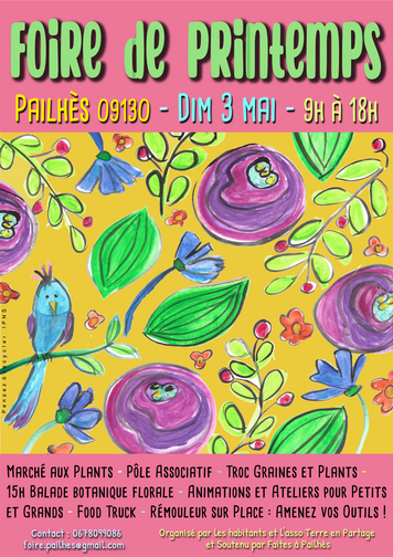 La 4ème édition de la Foire de Printemps de Pailhès aura lieu le dimanche 3 mai, de 9h à 18h, organisée par l'association Terre en Partage, avec le soutien de Faites à Pailhès et de la Mairie de Pailhès.